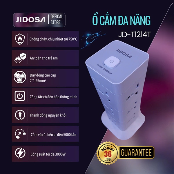 T1214T – Ổ cắm điện tháp vuông JIDOSA, cs 3000W, 12 ổ 3 chấu